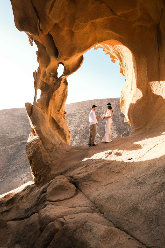 Fuerteventura is part of the Canary Islands with its climate of eternal spring. But as the name already suggests: Fuerteventura is known for its strong trade winds. It has enormous golden beaches and impressive dunes. Rain is rare. On this island many romantic locations are waiting for your elopement, accessible via gravel roads. In the rocky interior there are (less windy, but) stunning locations. Fuerteventura is a no-brainer if you like an elopement with some desert road movie vibes.